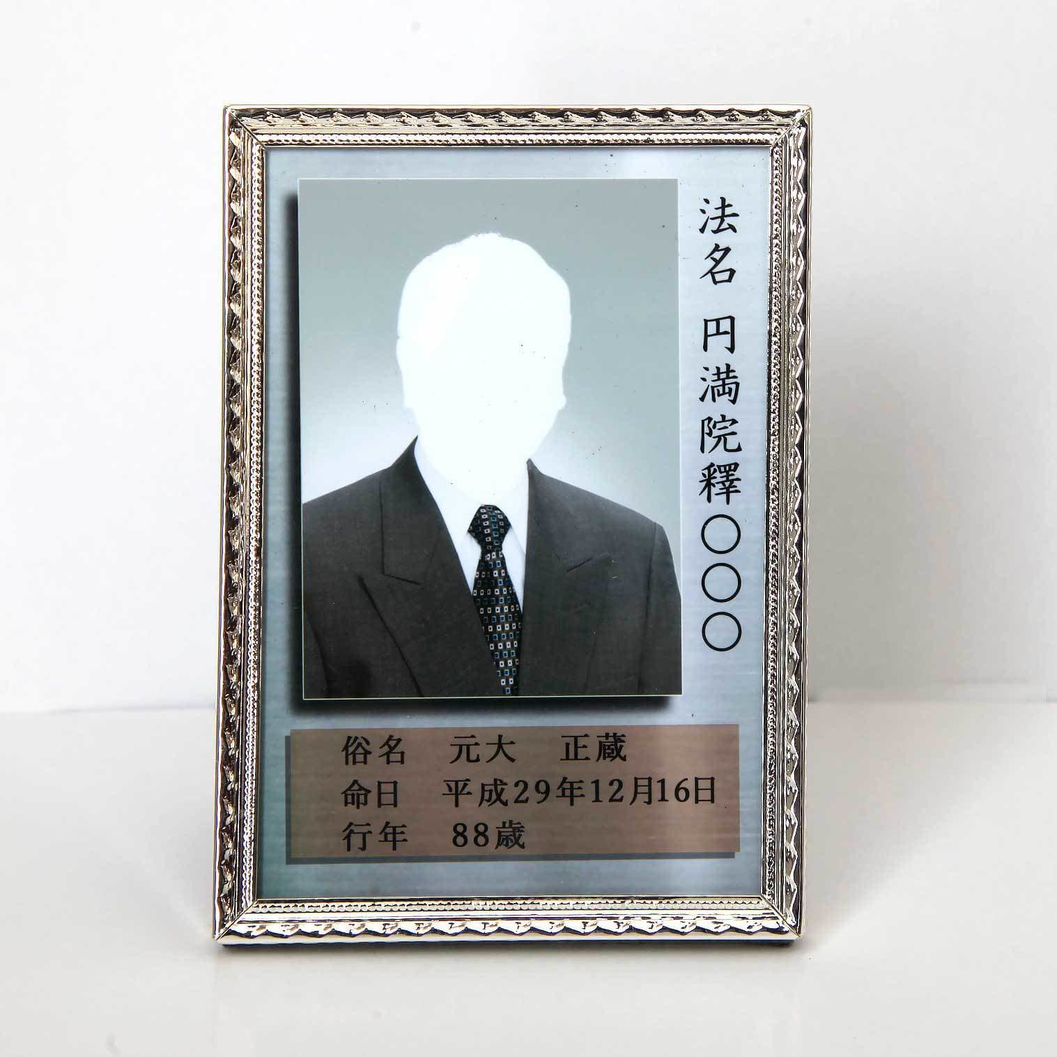 法名・戒名・俗名・命日・行年・享年をお入れします。遺影写真作成 名入れLサイズメタルフレーム横